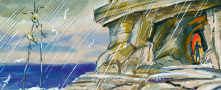 Недалеко от мальчика, на скате холма, чуть повыше того места, где река омывала холм, зияла, точно громадная разинутая пасть, широкая чёрная дыра, которая вела в глубокую пещеру.