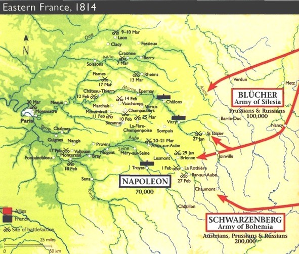 «В самом конце 1813 года 450 тыс. союзников вышли на берег Рейна и форсировали реку, вступив на землю Франции. Несмотря на то, что Наполеон располагал всего 160 тыс. солдат, он смог нанести ряд поражений союзным армиям. Члены коалиции предложили императору заключить мир на условиях сохранения французских границ 1792 года, но Бонапарт отказался. В конце февраля – начале марта он проиграл сражения при Лионе и Арси-сюр-Об, а 18 марта союзники вошли в капитулировавший Париж. 25 марта 1814 года в Фонтенбло Наполеон Бонапарт подписал отречение и был сослан на остров Эльба в Средиземном море.» [2].