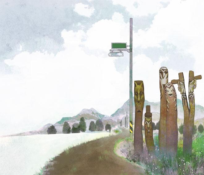 — Смотри! Это стражи, охраняющие деревню! — воскликнул Тэхи, кивнув на пять деревянных столбов возле указателя.