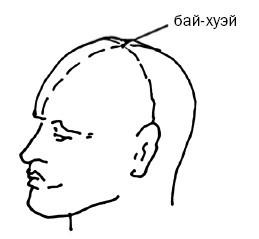Точка 8 – область родничка у детей, это одна из самых важных точек в китайской медицине. Ее называют бай-хуэй («сто пересечений»). Точка расположена на пересечении срединной линии головы и линии соединения верхней точки ушей (рис. 2, б).