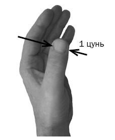 1 цунь – это ширина большого пальца левой руки по линии, проходящей через угол ногтевого ложа (фото 1).