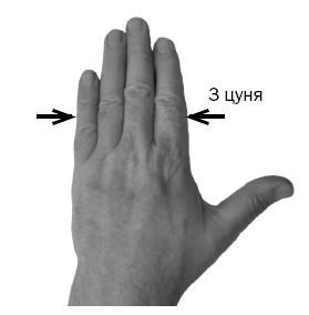 Чтобы отмерить 3 цуня, складываем четыре сомкнутых пальца выпрямленной ладони, как это изображено на фото 2.