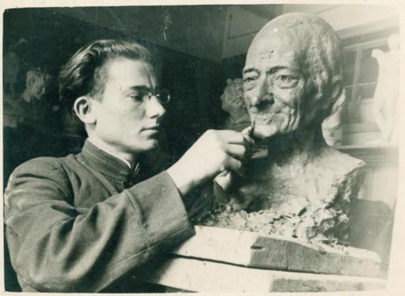 Потом была война. В поселковом совете на общем собрании говорили: " Напали на нас, товарищи, с трех сторон: Гитлер, Немец и …Германец! «А Володька и другие пацаны только сделали новые поджиги и рогатки с красной резиной, далеко и метко стрелявшие свинцовыми пломбами!.. В войну работал пастухом, объезжал лошадей… оформлял клуб, пожарный уголок… Сразу после войны Володя приехал поступать на скульптурное отделение в Московское художественно-промышленное училище имени Калинина (позже вошедшее в состав Строгановки) и поступил, хотя конкурс был огромный, поступали по- настоящему талантливые ребята, к тому ж фронтовики, красивые, с орденами. А он худой, в старой телогреечке… Поступил бы, пожалуй, и в Суриковку (Институт имени Сурикова), но время было голодное, мать умерла, а здесь было что-то вроде пансиона и куратором считался… сам Михаил Иванович Калинин.