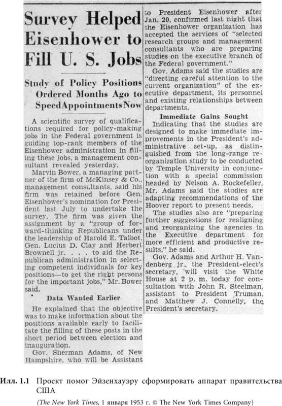 Когда Марвин начал заниматься консалтингом, у него появилась возможность сотрудничать со многими руководителями компаний, которым давались рекомендации и которые были инициаторами перехода к менее жестким иерархическим структурам: Альфредом Слоуном, главой корпорации General Motors; Чарльзом Мортимером, председателем совета директоров General Foods; Кроуфордом Гринуолтом, председателем совета директоров DuPont; Ральфом Кординером, генеральным директором General Electric; Джоном Лаудоном, председателем совета директоров Royal Dutch Shell; Томасом Дж. Уотсоном-мл., президентом компании IBM; и даже с президентом США Дуайтом Эйзенхауэром, который с помощью Марвина Бауэра резко сократил численность аппарата Белого Дома и предоставил его ключевым сотрудникам небывалую автономию18. До этого в Белом Доме республиканцев не было уже двадцать лет. Национальный комитет республиканской партии считал, что необходим пересмотр функций сотрудников аппарата, поэтому Эйзенхауэр решил сделать нечто беспрецедентное: он пригласил человека «со стороны», т.е. из консалтинговой фирмы, изучить проблемы, с которыми столкнутся он и его новая администрация. Решение Эйзенхауэра воспользоваться услугами команды Марвина Бауэра из McKinsey отражало уважение, каким пользовались сам Бауэр и его компания у видных представителей бизнеса, к которым обратился президент за советом. К 1950-м гг. Бауэр уже приобрел прочную репутацию профессионала, олицетворяющего лучшие образцы консалтинга, — человека, пользующегося неограниченным доверием и уважением за его преданность интересам клиентов (илл. 1.1).