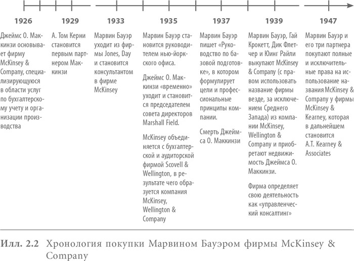 Почти одновременно с кончиной Маккинзи завершилась работа с самым крупным клиентом McKinsey, Wellington — компанией U.S. Steel, для которой проводился проект, и фирма перестала получать прибыль. Именно в это время Марвин возглавил группу, которая выкупила McKinsey из совместной с Wellington фирмы (илл. 2.2).