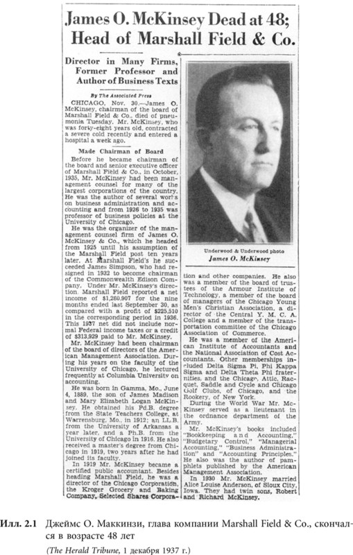 Вскоре, в конце 1937 г., Джеймс О. Маккинзи неожиданно скончался от пневмонии (илл. 2.1). Вот что рассказывает Марвин об этом в своих мемуарах: