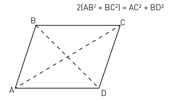 А если противоположные стороны у него еще и параллельны (новая связь!), то параллелограмм являет нам, например, весьма нетривиальное свойство: сумма квадратов сторон равна сумме квадратов диагоналей (рис. 3).