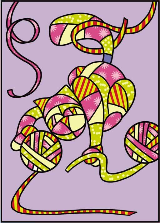 Склейте скотчем два куска обоев лицевыми сторонами внутрь. Нарисуйте на оборотной стороне кошку, играющую с клубком. Нанесите на рисунок разметку будущих лоскутов. Простым карандашом отметьте, какому фрагменту будет соответствовать та или иная ткань, присвоив каждой из них свой номер.