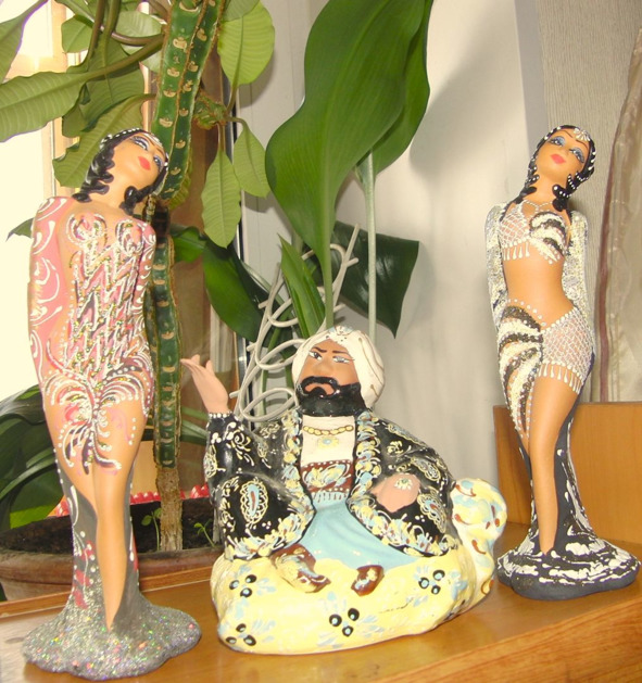 Все они были из разных мест. Казак с шашкой за поясом и казачка в цветочном венке — из Ростова на Дону; толстый глиняный бай в пестром халате, белой чалме с двумя гибкими танцовщицами в полупрозрачных платьях — из Узбекистана; маленькая стройная японочка в шёлковом розовом кимоно, украшенном крошечными голубыми птичками, держала в руках тончайший, словно сотканный из паутины, зонтик; индийская танцовщица в ярком украшенном разноцветными бусинками сари; скромная русская барышня в розовом платье и таком же чепчике из волжского города Мышкина; две боярыни в старинных кокошниках расшитых яркими нитками мулине, — из Нижнего Новгорода; стрелец с большой секирой в руках времён царя Петра; две куклы из Китая, изображающие актёров китайского театра драмы, с чёрными косичками, висящими ниже пояса, в длинных кимоно, расшитых золотыми драконами… При первом взгляде на них все думали: женщины в диковинных нарядах, а хозяйка знала, что эти куклы — мужчины.