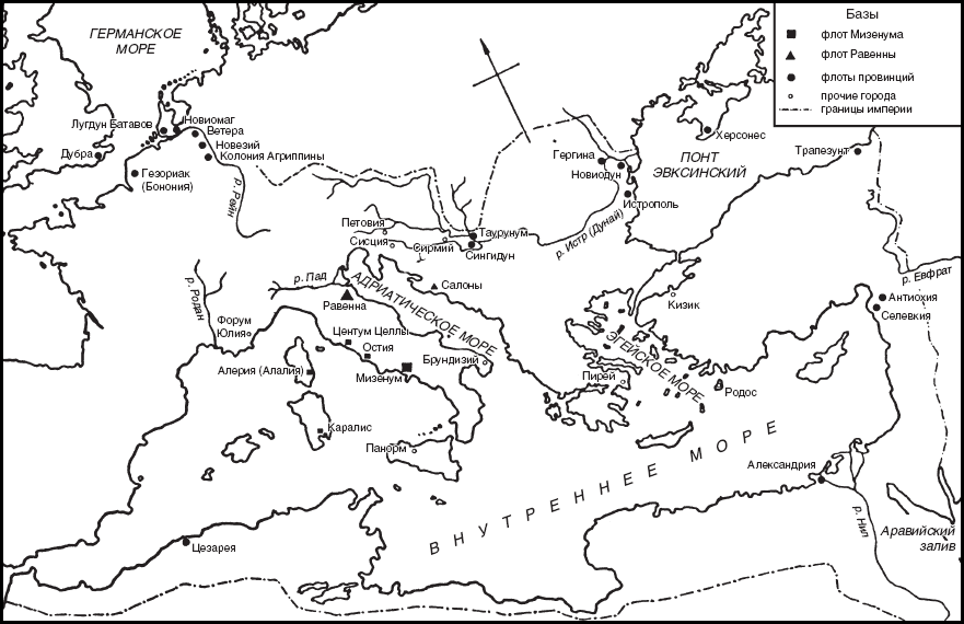 Предшествующий анализ наших этнографических источников может рассматриваться отчасти как подтверждение древней итоговой оценки военно-морской политики Августа: «Classem Miseni et alteram Ravennae ad tutelam Superi et Inferi maris conlocavit» («Один флот поставил у Мизенума, а другой – у Равенны, для обороны Верхнего и Нижнего морей»).[93] Однако, как мы увидим далее, это замечание не является единственной констатацией мер, предпринятых самим Августом в рамках военно-морской политики, и это, конечно, нельзя считать определением роли итальянских флотов за весь период их существования. Если они действительно имели главные бухты и вспомогательные стоянки главным образом в стратегических портах на побережьях Тирренского и Адриатического морей, то военно-морская история империи покажет, что итальянские флоты были активны еще и в Средиземноморье. По крайней мере, со времени правления Веспасиана и далее это были по преимуществу имперские флоты.