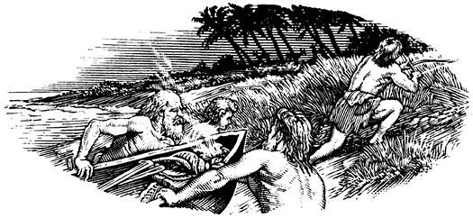 Притаившись в траве над откосом, Амагаст изучал остров. Вдруг он тихо зашипел сквозь зубы — сигнал охотника, — и все замерли. Саммадар жестом приказал всем лечь, потом подозвал к себе. Раздвигая перед собой траву, Керрик пополз за остальными.