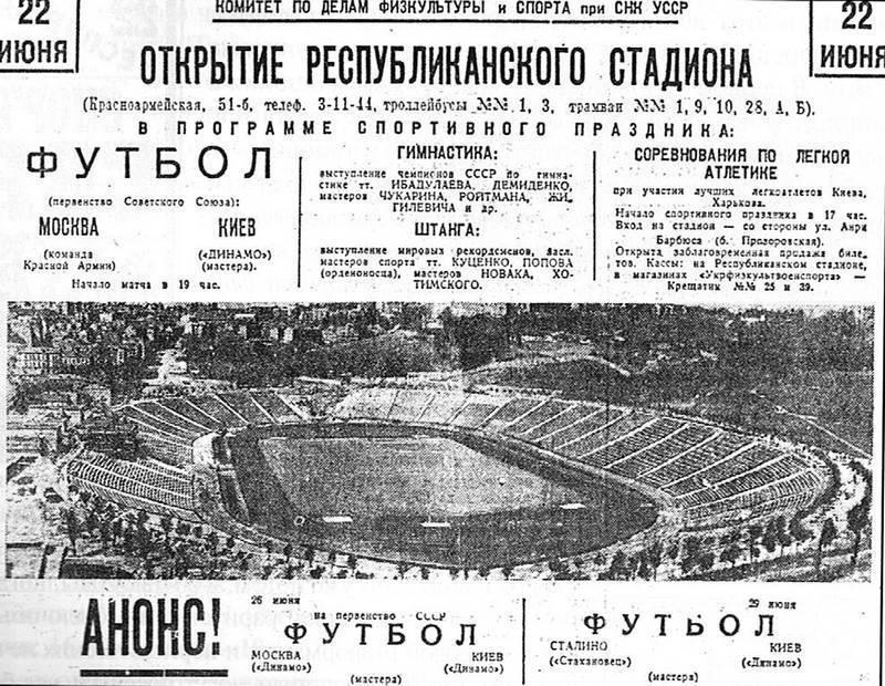 19 июня на стадионе «Динамо» состоялся последний довоенный матч в Москве – хозяева поля, лидеры первенства Советского Союза, принимали сталинградский «Трактор». Игра, собравшая 30 тысяч зрителей, завершилась вничью – 1:1. В воскресенье 22 июня там же, на «Динамо», должны были состояться парад и массовые соревнования физкультурников.