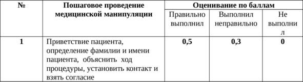 Промежуточный и итоговый контроль включает перечень разработанных параметров профессиональной деятельности по освоению определённого умения в виде чек- листов (check-list), где указывается: коммуникативные навыки, цель, показания, противопоказания, осложнения, оснащение, алгоритм действия, спросил ли студент о состоянии пациента после процедуры.