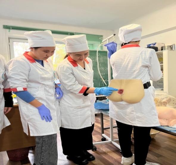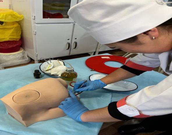 На фото №1 студенты изучают стадии развития пролежней, фото №2 проводят постановку газоотводной трубки