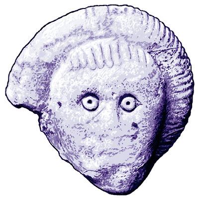 Кельты в Британии процарапали глаза и волосы на конкреции с крупной раковиной аммонита, причем ее внешний оборот стал напоминать нимб.