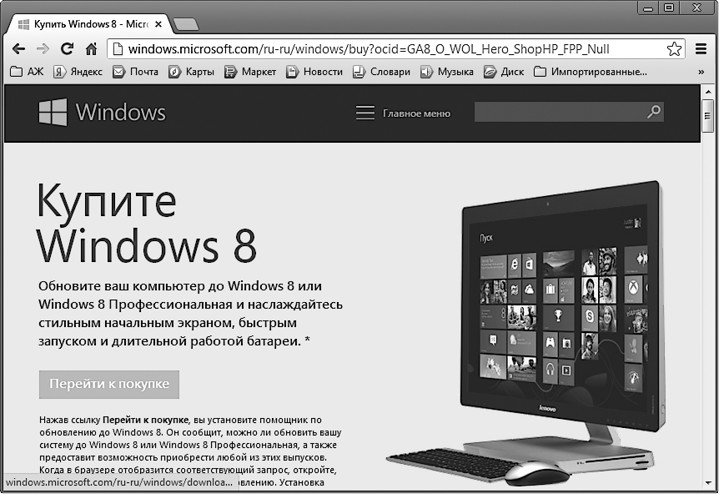 Скажите ему, пусть зайдет на http://windows.microsoft.com и нажмет ссылку Скачать и купить, а в открывшемся окне — Купите Windows 8. Появится окно покупки ОС. Не беспокойтесь, сразу деньги платить не придется. Просто нажмите кнопку Перейти к покупке (рис. 1.2).