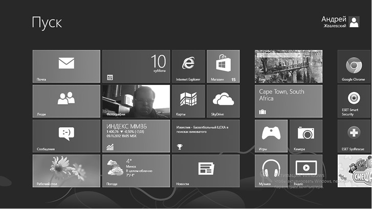 После инсталляции системы вас ждет сюрприз. Особенно удивятся те, кто имеет опыт работы с Windows. Никакого привычного Рабочего стола (см. гл. 3) вы не обнаружите. Вместо него — какие-то плиточки (рис. 2.1).
