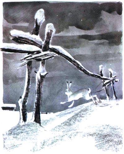 Заяц-русак жил зимою подле деревни. Когда пришла ночь, он поднял одно ужо, послушал; потом поднял другое, поводил усами, понюхал и сел на задние лапы. Потом он прыгнул раз-другой по глубокому снегу и опять сел на задние лапы и стал оглядываться. Со всех сторон ничего не было видно, кроме снега. Снег лежал волнами и блестел, как сахар. Над головой зайца стоял морозный пар, и сквозь этот пар виднелись большие яркие звезды.