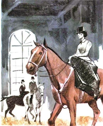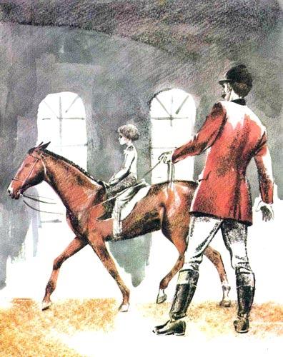 Когда пришла середа, нас троих повезли в манеж. Мы вошли на большое крыльцо, а с большого крыльца прошли на маленькое крылечко. А под крылечком была очень большая комната. В комнате вместо пола был песок. И по этой комнате ездили верхом господа и барыни и такие же мальчики, как мы. Это и был манеж. В манеже было не совсем светло и пахло лошадьми, и слышно было, как хлопают бичами, кричат на лошадей и лошади стучат копытами о деревянные стены. Я сначала испугался и не мог ничего рассмотреть. Потом наш дядька[1] позвал берейтора[2] и сказал:
