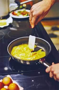 Смешайте яйца и добавьте их на сковородку тогда, когда масло едва начнет пузыриться. Добавлять смесь нужно ровно в центр сковороды. Не волнуйтесь: если вы использовали достаточно масла на сковороде, яйца не прилипнут и идеально распределятся по ней.