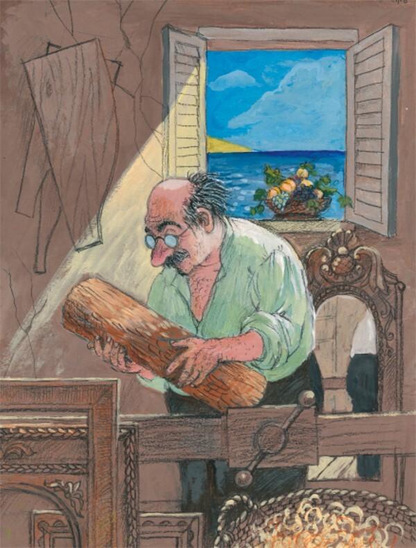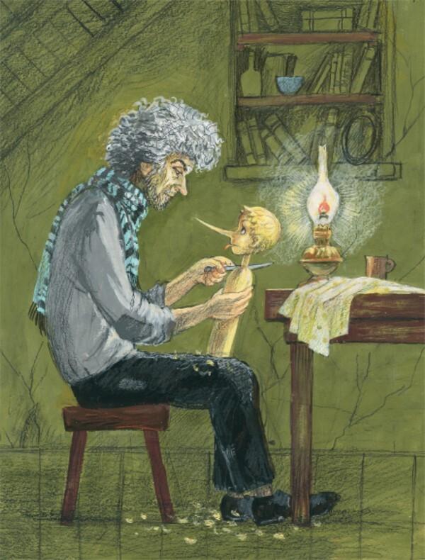 Карло вошёл в каморку, сел на единственный стул у безногого стола и, повертев так и этак полено, начал ножом вырезать из него куклу.