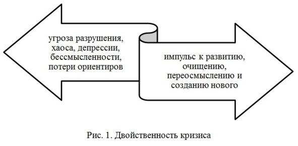 На рисунке 1 продемонстрирована двойственная природа кризиса как явления. С одной стороны, кризис несет в себе угрозу разрушения, хаоса, депрессии, бессмысленности, потери ориентиров. С другой стороны, кризис в философии часто воспринимается как импульс к развитию, очищению, переосмыслению и созданию нового. Своего рода шанс для качественного скачка, для выхода из застоя, для осознания истинного положения вещей и поиска новых путей. Кризис может быть точкой, которая заставляет человека или общество пробудиться, изменить свои установки и двигаться к более глубокому пониманию и состоянию. Философия кризиса помогает не только распознавать эти переломные моменты, но и активно участвовать в формировании их исхода, стремясь к обновлению и переосмыслению, а не только к выживанию или сохранению старого.
