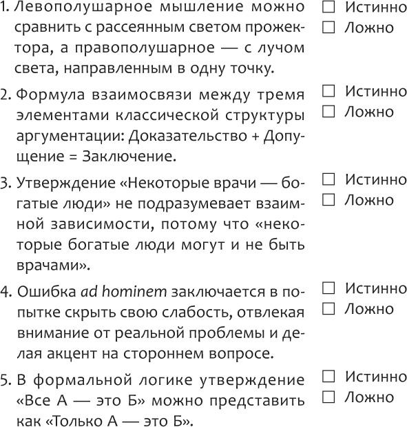 В разделе «Анализ аргументации» (глава 4) показано, как разложить аргументацию в соответствии с классической структурой: заключение, доказательство и допущение. Умение понимать, оспаривать и защищать аргумент — один из фундаментальных навыков мышления.