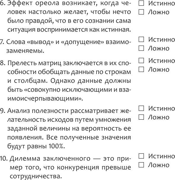 Раздел «Принятие решений» (глава 3) посвящен прикладным рассуждениям и знакомит с различными инструментами, которые помогут структурировать процесс принятия решений или дать ему количественную оценку. Основные инструменты — «ячейки» и «деревья» — нужны для того, чтобы эффективно и организованно подходить к решению проблем. Другие методы, такие как взвешенное ранжирование и анализ полезности, позволяют количественно оценить качественные решения, например при выборе профессии или приеме на работу, даже если денежный фактор не является определяющим.