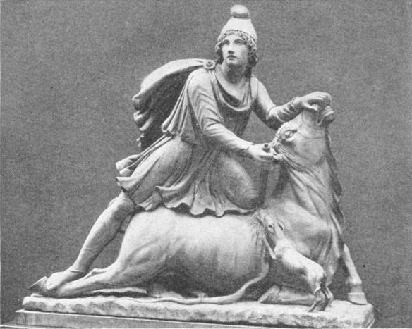 The rise of the Roman empire opened the western European world to this growing cult. The temples of Serapis-Isis, the chanting of the priests and the hope of immortal life, followed the Roman standards to Scotland and Holland. But there were many rivals to the Serapis-Isis religion. Prominent among these was Mithraism. This was a religion of Persian origin, and it centred upon some now forgotten mysteries about Mithras sacrificing a sacred and benevolent bull. Here we seem to have something more primordial than the complicated and sophisticated Serapis-Isis beliefs. We are carried back directly to the blood sacrifices of the heliolithic stage in human culture. The bull upon the Mithraic monuments always bleeds copiously from a wound in its side, and from this blood springs new life. The votary to Mithraism actually bathed in the blood of the sacrificial bull. At his initiation he went beneath a scaffolding upon which a bull was killed so that the blood could actually run down on him.
