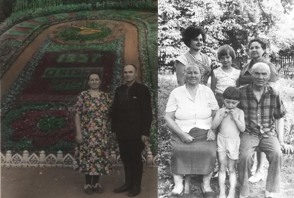 Отец и мать на курорте в Кисловодске. Фото из семейного архива. 1957г. (слева); Отец и мать с дочерью Валентиной, внучками Людой и Леной, правнуком Русланом. Фото автора (справа)