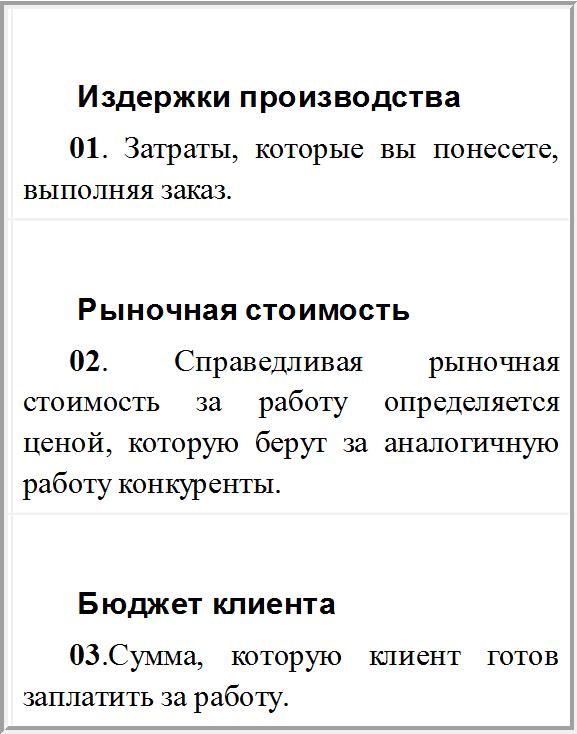 Эти три показателя используются для создания ценового диапазона – интервала от самой низкой до самой высокой цены, из которого можно осознанно выбрать конкретную стоимость проекта.