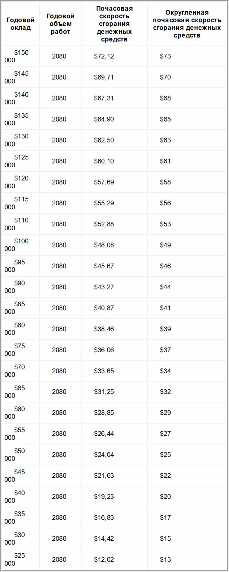 В таблице ниже представлен расчет почасовой скорости сгорания денежных средств на основе годовой заработной платы в диапазоне от 25 000 до 150 000 долларов в год.