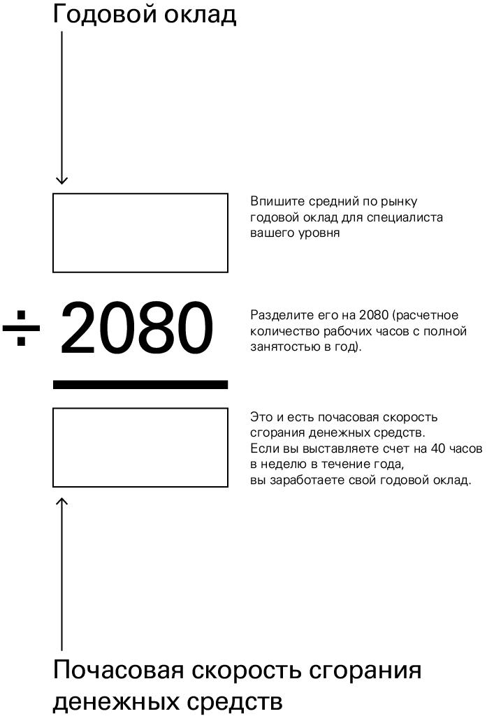 В таком случае мне нужно или работать на 25 % больше часов в неделю, ИЛИ рассчитывать свою почасовую скорость сгорания денежных средств, уменьшив 2080 часов на 25 %. Вы, вероятно, будете делать первое, а должны делать второе (особенно если рассчитываете на праздники или хотите взять отпуск один или два раза в год).