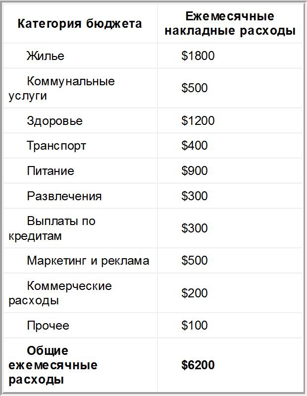Исходя из этих расходов, каждый месяц вам необходимо 6200 долларов на жизнь. Если вы зарабатываете 6100 долларов в месяц, вы в убытке. Если вы зарабатываете 6300 долларов в месяц, то остается 100 долларов прибыли, которые можно отложить или на что-нибудь потратить.