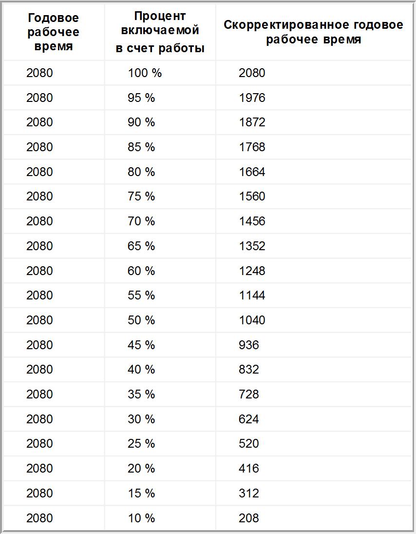 В таблице ниже показано годовое рабочее время в часах, сокращенное на 5 %. Первый столбец показывает 2080 часов в году – наши 40 часов в неделю и 52 недели. В следующем столбце показан процент времени, которое у вас осталось для работы, включаемой в счет. В последнем столбце отображается фактическое количество годового рабочего времени, затраченного на включаемую в счет работу, с корректировкой на подлежащий оплате процент работы.