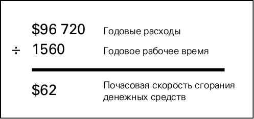 Таким образом, необходимо разделить 96 720 долларов на 1560 часов (а не на 2080), и вы получите почасовую скорость сгорания денежных средств в размере 62 доллара в час.