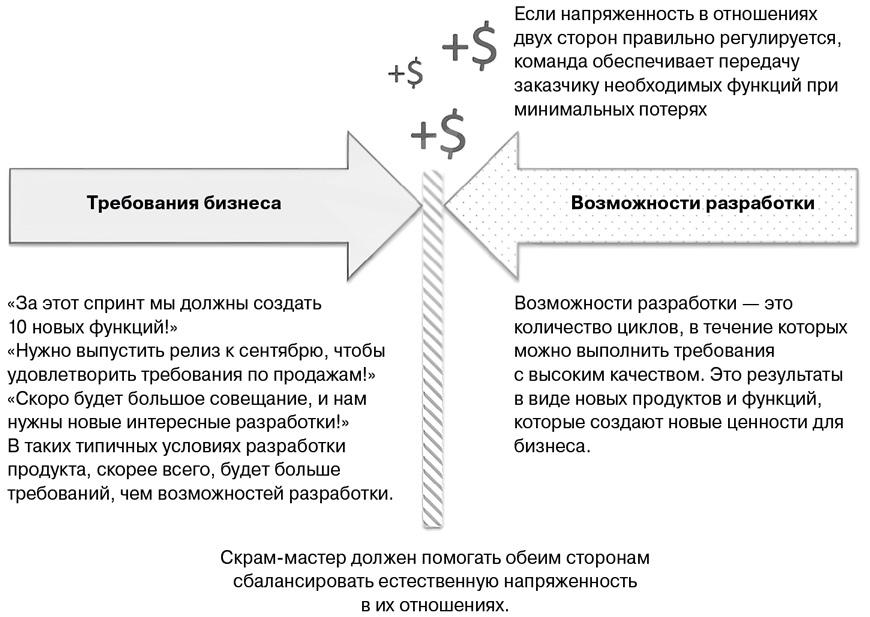 На этой иллюстрации я попыталась изобразить противоборствующие силы производства и требований. Бизнес все время требует у технической команды разработки новых функций и новых продуктов. Требования могут исходить, скажем, от топ-менеджера с новыми полномочиями или от менеджера продукта со своей потребностью в новой, классной функциональности. Профессиональный скрам-мастер может указать бизнесу, что баланс интересов слишком склоняется в одну сторону, и, что самое главное, помочь команде максимально эффективно использовать собственные возможности для удовлетворения требований бизнеса с максимальным качеством. Как правило, идеального долгосрочного решения в таких ситуациях не существует: задача скрам-мастера состоит скорее в том, чтобы помочь организации найти идеальные текущие решения в меняющихся (у обеих сторон) условиях.