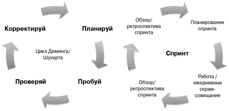 Концепции, лежащие в основе скрама, своим корнями уходят еще глубже в историю. В 1950-х гг. консультант по менеджменту Уильям Эдвардс Деминг придумал цикл «планируй — пробуй — проверяй — корректируй» (Plan — Do — Check — Act, или PDCA) как модель постоянного улучшения, известную также под названиями «цикл Деминга» или «цикл Шухарта». Эта концепция давно использовалась в так называемом бережливом подходе концерна Toyota к производству. Эти идеи один в один совпадают с концепцией спринта в скраме с его ежедневными скрам-совещаниями (как показано на рисунке ниже и далее в книге). Но Деминг не знал, что он практиковал скрам. Вернее, это современные скрам-команды не всегда осознают, что они применяют цикл Деминга!