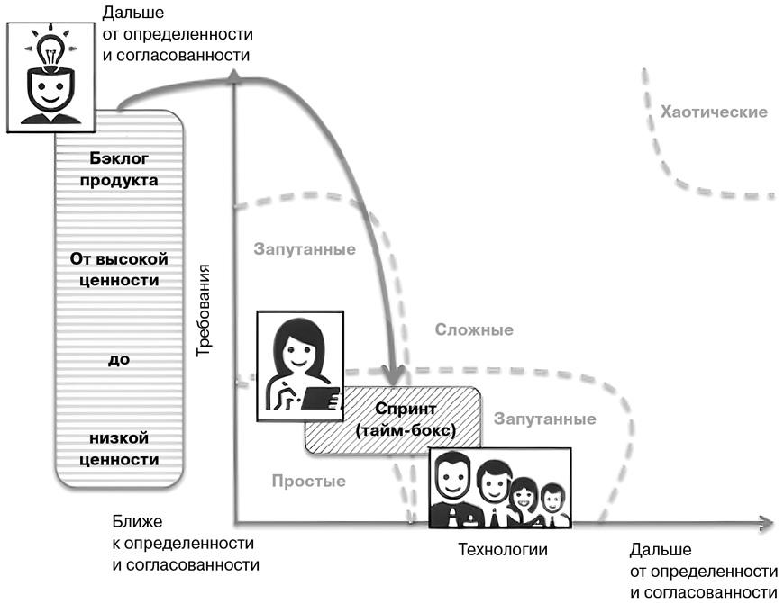 Даже если матрица профессора Стейси и статья Бун и Сноудена задают удобные рамки для размышлений, как правильно выбрать процесс для той или иной ситуации, не стоит слишком упрощать этот материал! Профессор Стейси перестал публиковать матрицу после второго издания своей книги (на сегодня вышло уже шесть). Что же случилось? Профессор Стейси считает, что аудитория слишком упростила матрицу: люди уверены, будто могут самостоятельно выбирать инструмент в зависимости от характера своего проекта. Все не так просто, согласно Стейси: «Итог — это результат взаимодействия между намерениями и стратегией всех вовлеченных в проект сторон, и ход этого взаимодействия никто предсказать не в силах из-за природной неопределенности и непредсказуемости, присущей нашей с вами жизни». Иначе говоря, проблемы устраняет не скрам, их устраняют люди; скрам только показывает, где искать проблемы. Люди сами должны бороться с этими проблемами и придумывать различные решения для различных сценариев. В этой книге рассказывается, как скрам-мастер может содействовать поиску таких решений — как внутри команды, так и вне ее.
