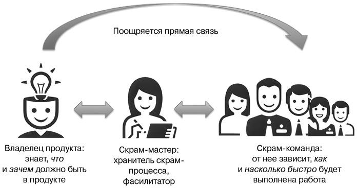 Этот раздел — краткий обзор трех ролей в скраме: скрам-команда, владелец продукта и скрам-мастер. Наша книга посвящена в основном роли скрам-мастера, но мы подробно разберем и остальные роли, исходя из их естественных взаимосвязей. Как вы, наверное, сами понимаете, людей обычно очень беспокоит, какова их роль в коллективе и где границы их зоны ответственности. Мы более предметно поговорим о ролях в скраме (и не только в скраме) в главе 9 «Формирование аджайл-организации».