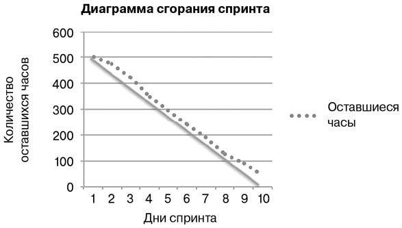 Диаграмма сгорания очень важна — ведь дата окончания спринта устанавливается раз и навсегда. Наряду с ежедневными скрам-митингами бэклог спринта и диаграмма сгорания наглядно показывают команде, когда она сбивается с ритма, и позволяют предметно обсудить, что можно предпринять для исправления ситуации. Диаграмма сгорания спринта «сжигает» часы работы по дням спринта, тогда как диаграмма сгорания релиза отражает выполнение единиц работы (часто оцениваемых в неких условных единицах) или количество спринтов, оставшихся до релиза. В главе 3 и 5 подробно рассказывается про бэклоги и диаграммы сгорания.