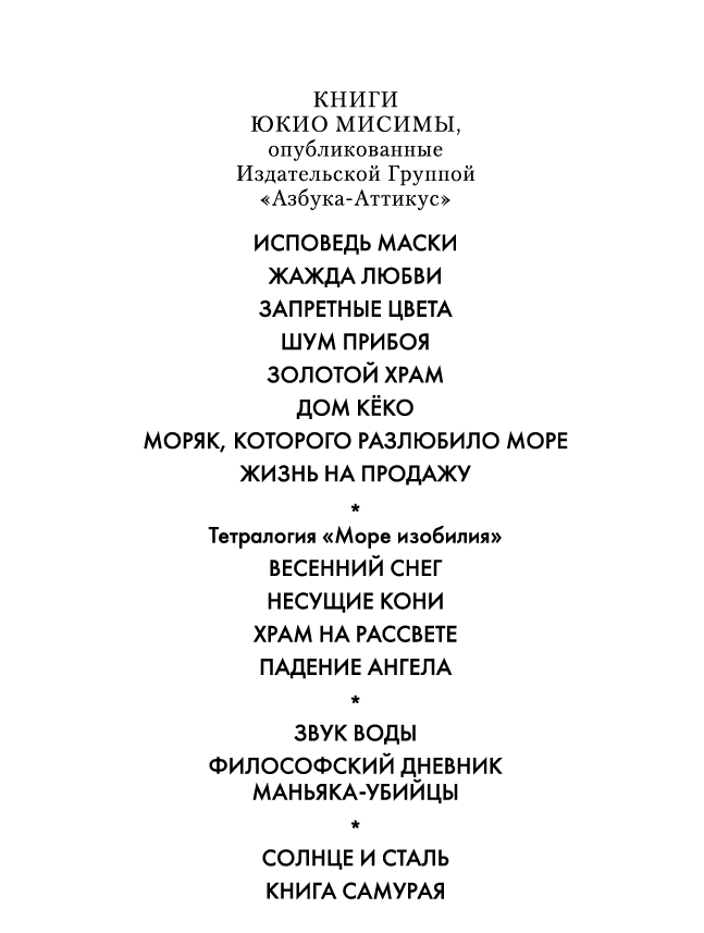 Юкио Мисима (1925–1970) — звезда литературы XX века, самый читаемый в мире японский автор, обладатель блистательного таланта, прославившийся как своими работами широчайшего диапазона и разнообразия жанров (романы, пьесы, рассказы, эссе), так и ошеломительной биографией (одержимость бодибилдингом, крайне правые политические склонности, харакири после неудачной попытки монархического переворота).