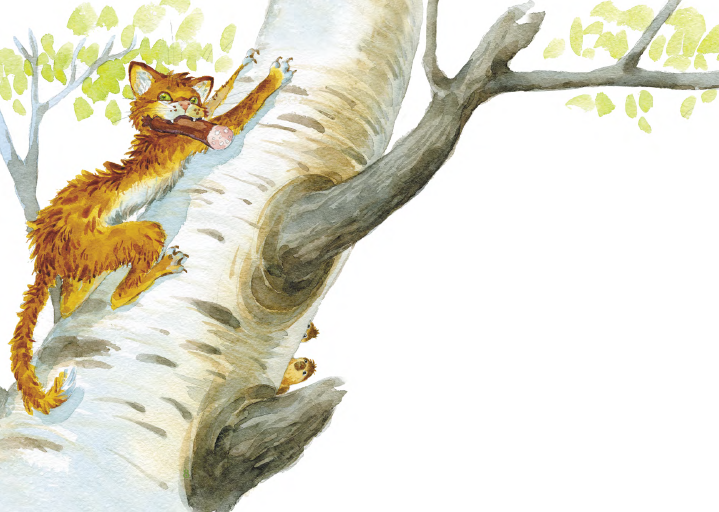 Но спасения не было, и кот решился на отчаянный поступок. С ужасающим воем он сорвался с берёзы, упал на землю, подскочил, как футбольный мяч, и умчался под дом.