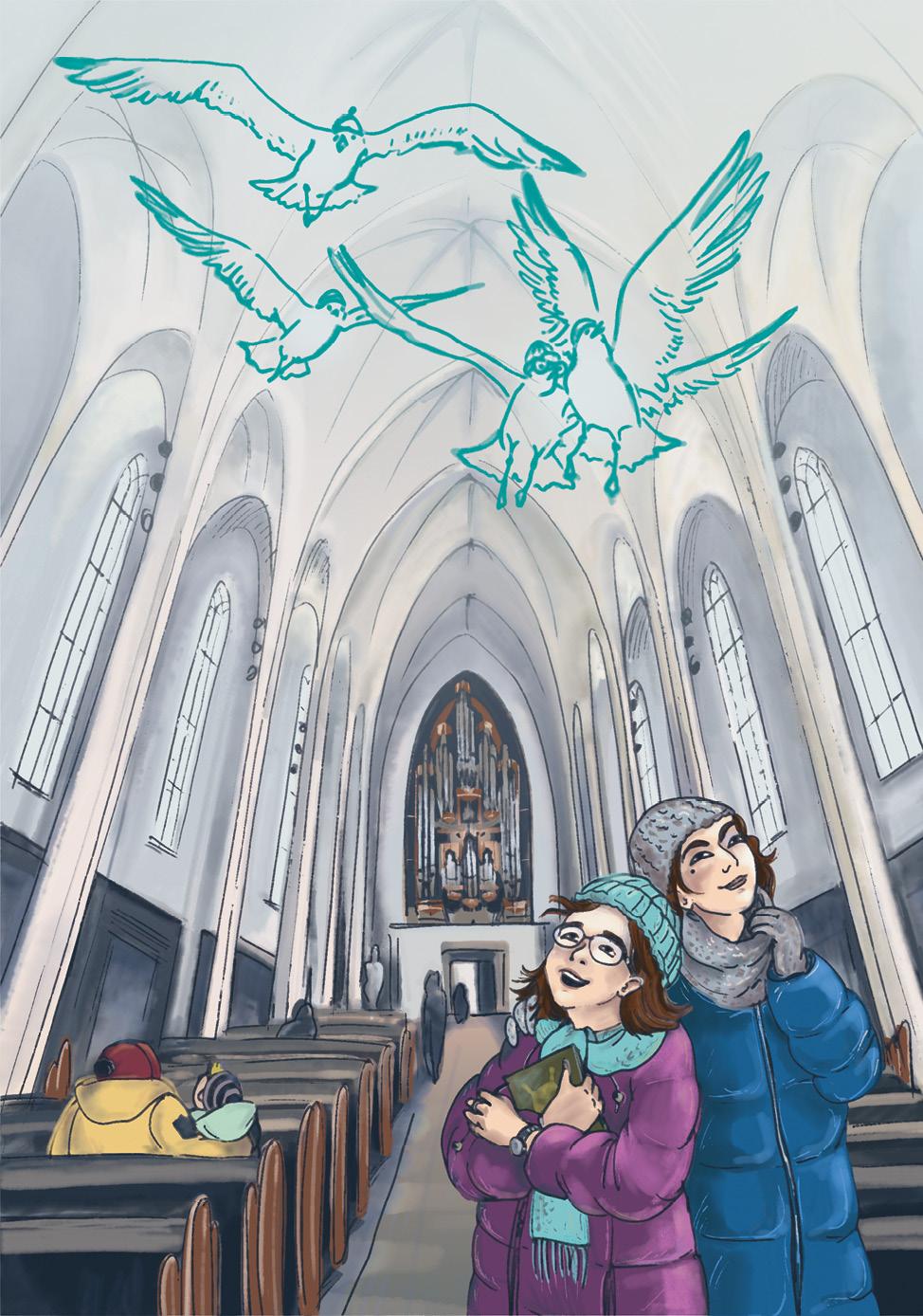 Внутри церкви было пустовато, как в гигантской пещере, только скамейки по обеим сторонам у прохода. Мама уже рассказывала нам про протестантов, в Риге мы видели такую церковь. Вот и тут почти не нашлось икон — всего две штуки, зато были большие окна и такой высокий потолок, что, казалось, под ним можно летать на самолёте. Ну или на вертолёте, маленьком таком, игрушечном. Чайки точно могли бы свободно реять над нашими головами внутри собора.