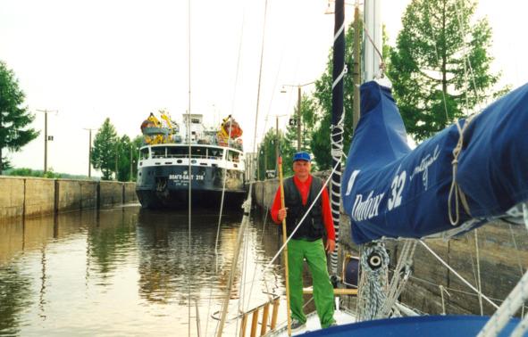 А на яхте опять не работал анемометр, барахлил лаг, никак мы не могли доделать полку и сетку для неё в кормовую каюту, ложемент солнечной батареи, а при креплении бортовых каютных сеток, в день отхода, просверлили газовый трубопровод, проходящий в коробе по левому борту. Хорошо, что все быстро среагировали, и не произошло пожара. Звонили знакомым, чтобы привезли большие паяльники, изобретали технологию ремонта. Помогать сразу пришел Леша Капустин. Доделывали все до ночи, а за пятнадцать минут до полуночи решили отходить, ведь завтра понедельник, а в понедельник и в пятницу 13-го, как известно, в плавание не выходят. Второпях при отходе с борта на пирс не спрыгнул Капустин, но тут же решено было взять его с собой до ближайшего удобного для отъезда места высадки, которым оказался Углич. Возвращаться плохая примета. Так Леха провел на борту пару прекрасных дней, а мы с удовольствием внимали рассказам известного яхтсмена.