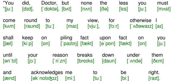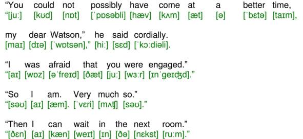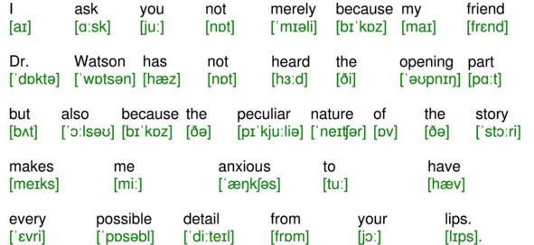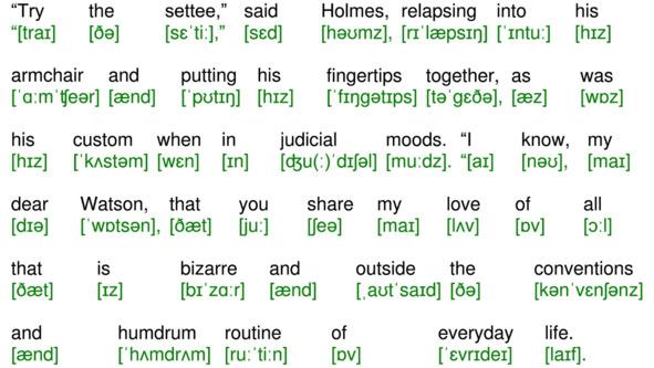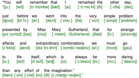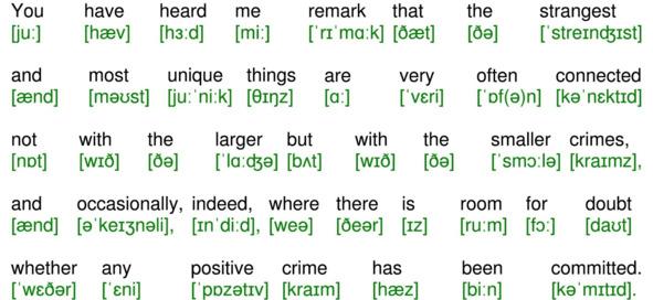 Для подготовки видеоролика использована бесплатная аудиокнига с публичного сайта Librivox (https://librivox.org/the-adventures-of-sherlock-holmes-version-4-by-sir-arthur-conan-doyle/), озвученная носителем языка (David Clarke), и бесплатная электронная книга с публичного сайта Project Gutenberg (http://www.gutenberg.org/ebooks/1661). Транскрипция, записанная символами международного фонетического алфавита, выполнена с помощью онлайн-переводчика английского текста в транскрипцию. Автор онлайн-переводчика — Дмитрий Янс (https://tophonetics.com/ru/).