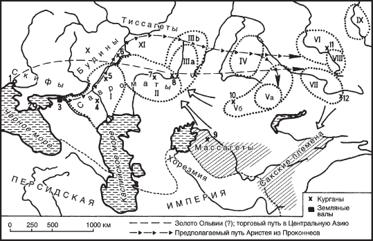 Рис. 1. Культуры VI–V веков до н. э., приписываемые ранним сарматам (савроматам Геродота), соседствовавшим с ними народам Европы и протосарматам (т. н. «ранним кочевникам») казахстанских степей: I – культуры нижней Волги; II – культуры Самары—Урала; IIIa – челябинская группа культур, IIIb – андроновская культура бронзового века (ирки); IV – культуры Северного Казахстана (другие скифские народности); Va – центральноказахстанская группа андроновской культуры (исседоны), V6 – находки «ранних кочевников» скифского периода; VI – андроновская культура на Верхней Оби, майэмирская культура скифского периода и большереченская культура (аргиппеи?); VII – область распространения восточноказахстанских находок андроновской культуры и следов «ранних кочевников» (аримаспов?); VIII – пазырыкская группа скифской культуры; IX – татарская культура (тохары?); X – городецкая культура (будины); XI – ананьинская культура (тиссагеты); 1 – Ольвия; 2 – Керчь—Пантикапей; 3 – Елизаветовское городище; 4 – могильный курган Соленое Займище; 5 – курганный могильник Блюменфельд; 6 – Старый Печеур; 7 – курганы Пятимары и Ак-Булак; 8 – Биш-Оба; 9 – курганный могильник Уйгарак; 10 – Мавзолеи могильников Дандыбай; 11 – курганный могильник Березовка; 12 – Чиликтинский курган