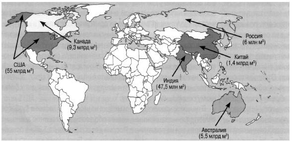 Метан угольных месторождений впервые начали добывать в США в восьмидесятых годах двадцатого века. Сегодня его добывают в Канаде, Австралии, Китае и других странах (рис. 2). Примечательно, что в 2011 г его промышленная добыча в США составила 55 млрд м3, в Канаде – 9,3 млрд м3, в Австралии – 5,5 млрд м3, в Китае – 1,4 млрд м3 [15]. В Индии и Российской Федерации осуществляют первые попытки по опытному его извлечению.