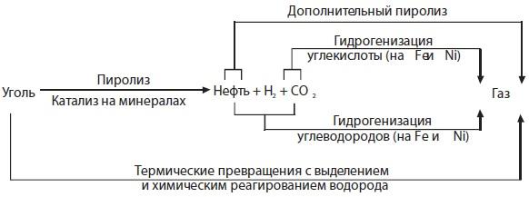 Данные по образованию природного газа в осадочных отложениях показали, что незрелые битуминозные угли сами по себе не выделяют газа, но при повышении температуры (в присутствии естественных минеральных катализаторов) в процессе термических п