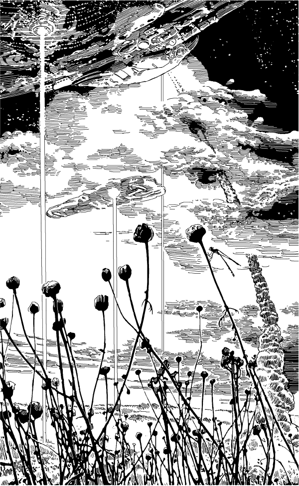 Корабль зашел на посадку и приземлился на плато в четверти мили от башни. Люк в борту мгновенно открылся, из него хлынули на землю десятки людей в серой форме и в защитных шлемах. Вооруженные чем-то вроде тонкоствольных винтовок, солдаты побежали к башне.